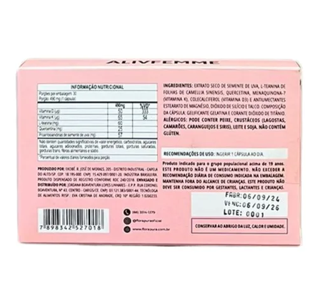 O Alive Femme 500mg – 30 cápsulas da Flora Pura é um suplemento formulado para apoiar o bem-estar feminino, especialmente durante períodos de estresse e desequilíbrio hormonal. Sua composição inclui extrato de semente de uva, L-teanina, quercetina, vitaminas D e K. O extrato de semente de uva é rico em antioxidantes, auxiliando na proteção contra os danos dos radicais livres. A L-teanina, derivada das folhas de Camellia sinensis, promove relaxamento sem causar sonolência, ajudando a reduzir o estresse. A quercetina é um flavonoide com propriedades anti-inflamatórias e antioxidantes, contribuindo para a saúde geral. As vitaminas D e K desempenham papéis essenciais na coagulação do sangue, no funcionamento muscular e no sistema imunológico. Este suplemento é indicado para mulheres que buscam equilíbrio emocional, suporte imunológico e proteção antioxidante.