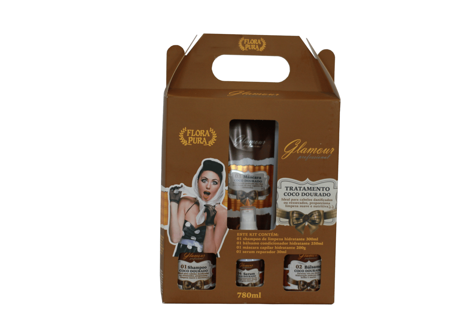 O Kit Glamour Coco Dourado 780ml, da Flora Pura, oferece nutrição rica para cabelos danificados ou ressecados.