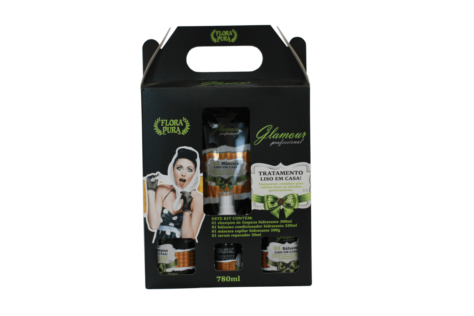 O Kit Glamour Liso em Casa 780ml, da Flora Pura, é dedicado ao alisamento controlado e manutenção do liso.