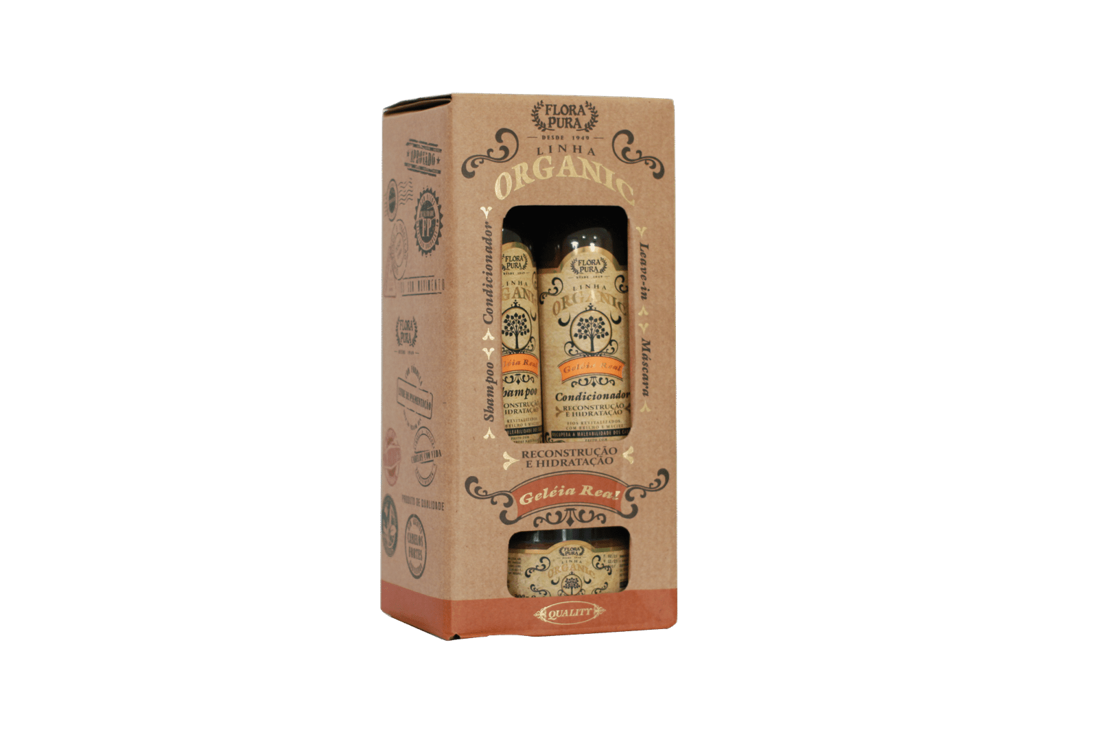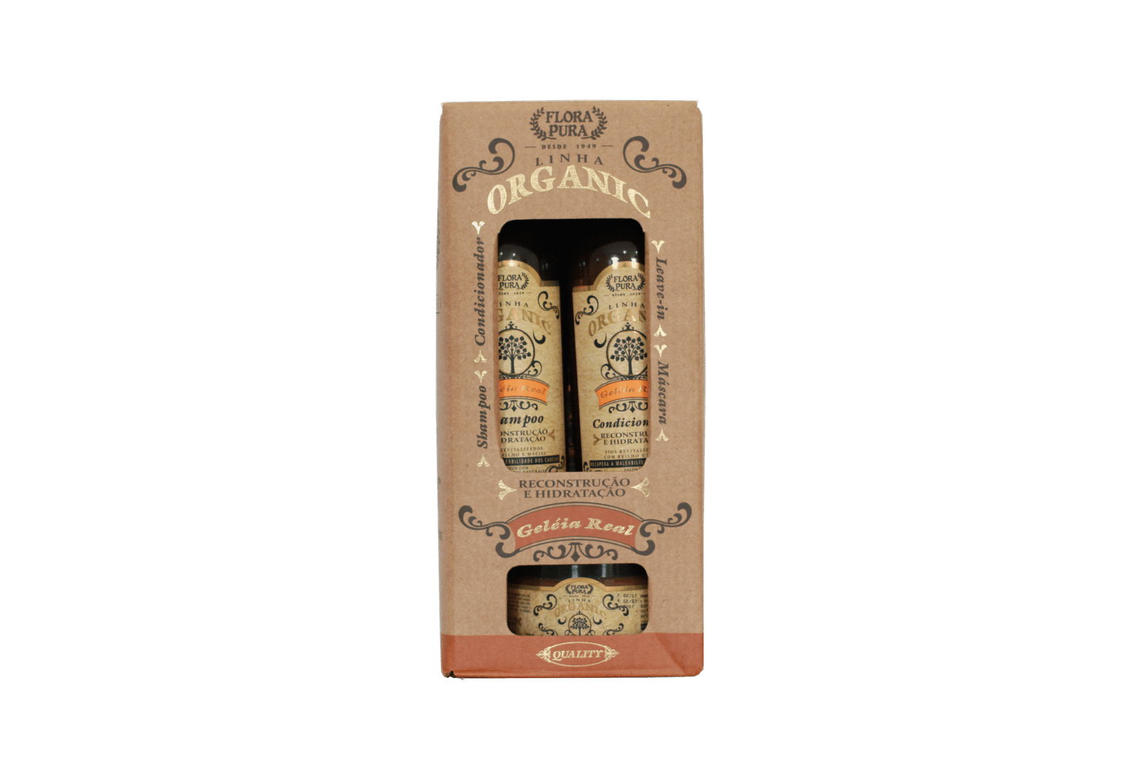 O Kit Organic Geleia Real, da Flora Pura, traz todo o poder nutritivo da geleia real misturado à proposta natural da linha Organic, ideal para quem quer tratar os fios com ingredientes ativos de origem vegetal e fórmulas mais limpas. Ele conta com extrato de geleia real e aloe vera, além de vitaminas como A, B5, B6, C e E, que juntos promovem reconstrução da fibra capilar, hidratação intensa, brilho natural, maciez e maleabilidade — além de proteger contra danos causados por químicas, sol e poluição. É uma opção excelente para cabelos que precisam de nutrição profunda sem abrir mão da qualidade e do compromisso da Flora Pura com produtos naturais, livres de parabenos e óleo mineral.